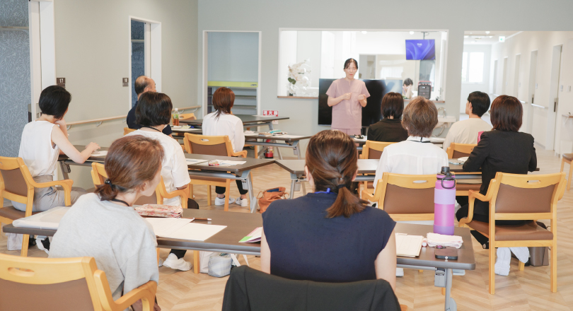 リアンドでは看護師・理学療法士・介護士がお互いに研修をしています。「こんな時どうしたらいいの〜?」というシチュエーション別の対応方法や専門的な視点からの意見などを共有し、職種間連携がより取りやすくなっています。