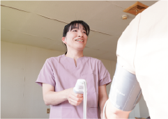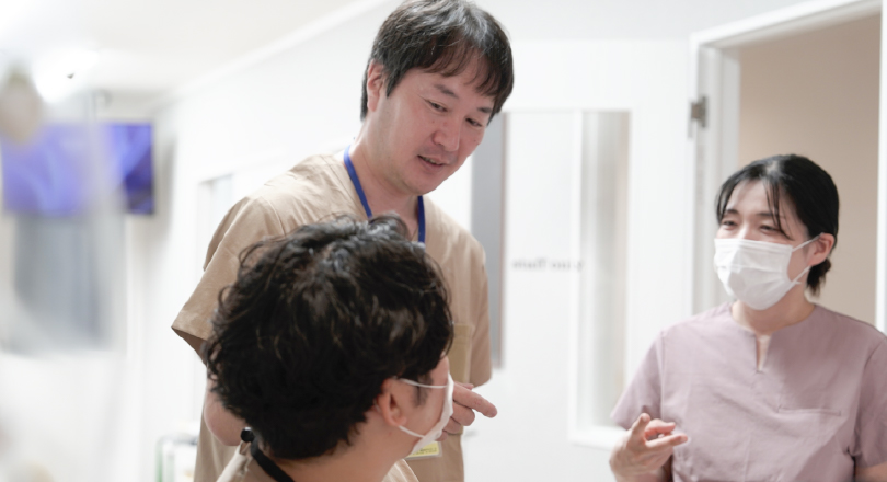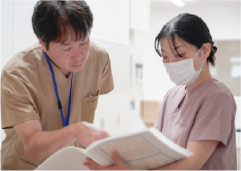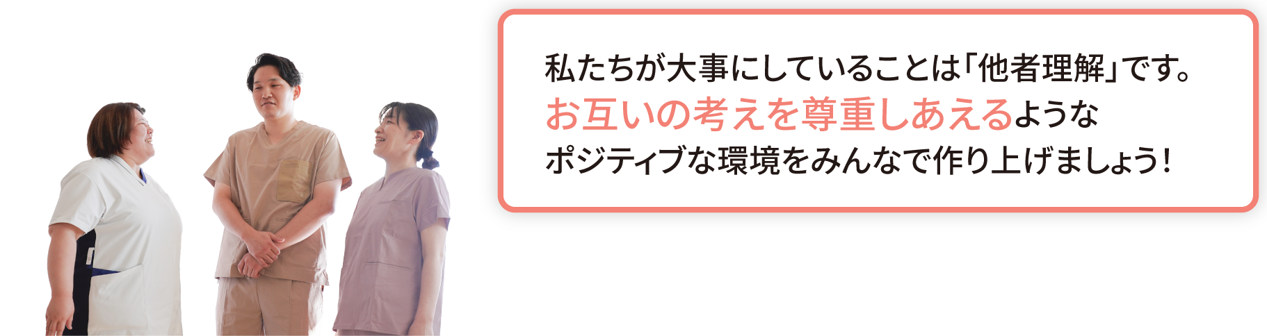 介護士、看護師、理学療法士それぞれの意見をお互いの立場になって考える文化があります。年齢・役職関係なく、遠慮なく共有できる雰囲気作りに努めてます。