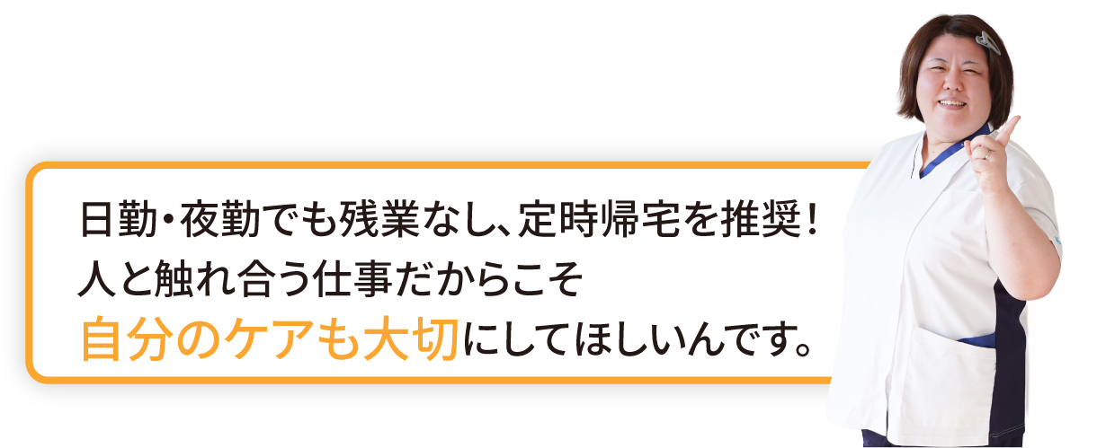 当施設では職種によっては、日勤・夜勤だけ、週2,3〜の短時間だけなど、働き方を選ぶことができます。自分の生活に合わせて働くことができます。